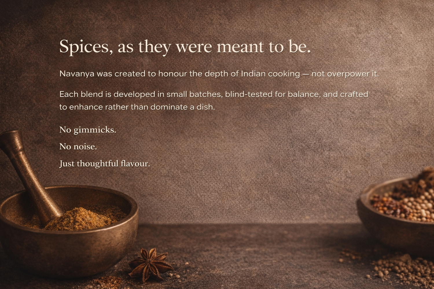 Balance is at the heart of everything we do. We understand that great food comes from the harmony of flavors. Our spice blends are designed to elevate your dishes, bringing depth, warmth, and authenticity to every meal. Whether you're preparing a family dinner or exploring new culinary horizons, Navanya spices are your partner in creating memorable food experiences.